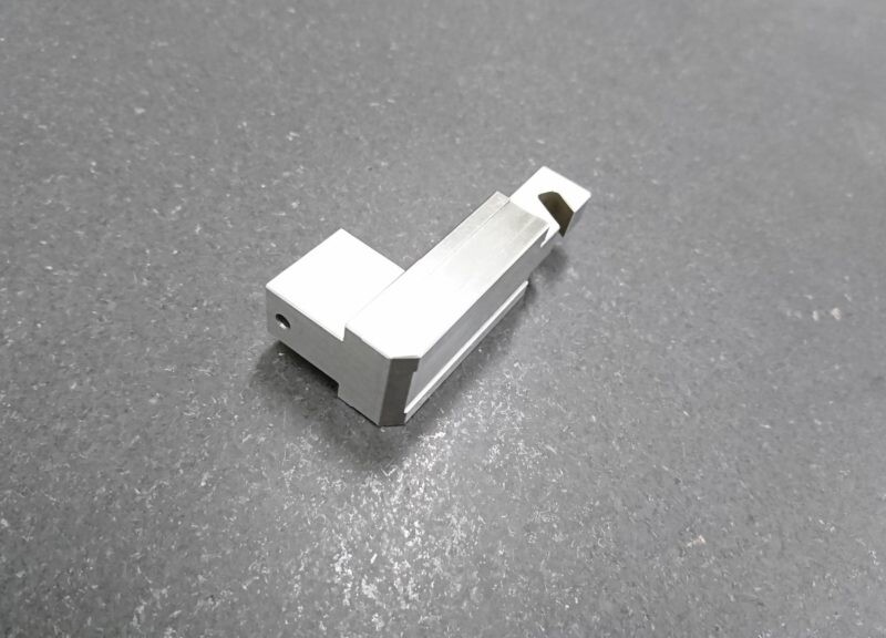 こちらは、愛知・静岡 加工部品調達センターが海外にて調達した、産業機械の一部品として使用されるSKS3製のチャック爪と呼ばれる製品です。SKS3材は、ゲージや工具の部品の材質として非常に多く利用される材質であり、タングステンを一部素材に含めていることから硬度を十分に保つことができる素材と言えます。本製品はツメと呼ばれるワークと接する部分(把持する。)の為、摩耗性が必要であることから、材質としてSKS3を採用しています。